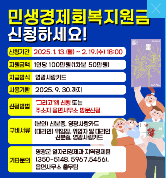 전남 영광군은 고물가 고금리 등 경기침체 장기화로 어려움을 겪는 군민들의 민생경제를 회복하고 내수활성화 촉진 및 지역경제 활성화를 위해 13일부터 민생경제회복지원금 1차분을 신청받아 지급하기 시작했습다. 현재 전국 지자체중 가장 많은 지원금인 1인당 100만원을 지급한다고 합니다. 영광군민께서는 본인이 대상이 맞는지 확인하시고 신청은 어떻게 하는지는 제가 지금부터 알기쉽게 간단하게 요약해드릴테니 한 분도 빠짐없이 100만원을 받으시기 바랍니다.