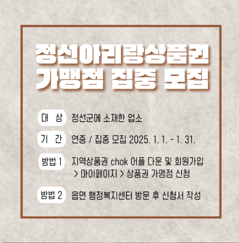 - 신청 기간: 2025년 1월 21 ~22일 개최되는 정선군의회 임시회에서심의 의결을 거친 후 빠른 시일내 지원금을 지급할 계획이니 정확한 사항은 정선군청의 공식발표를 확인해야합니다.